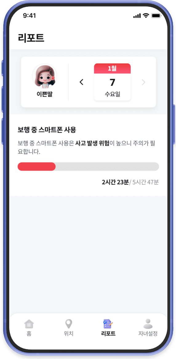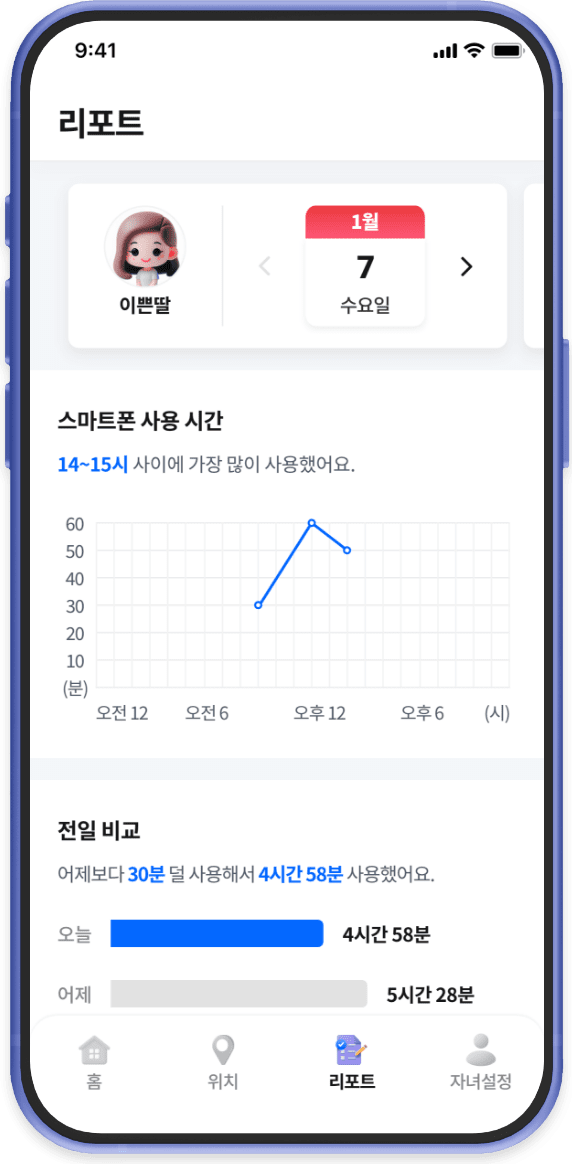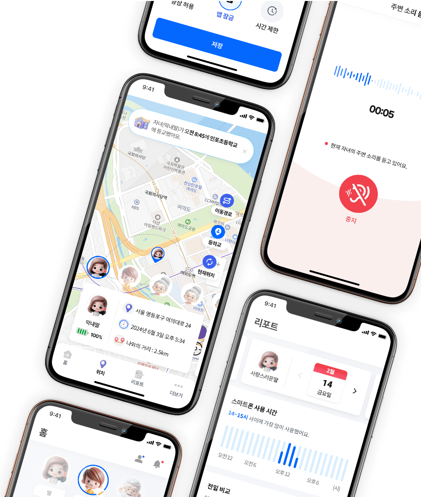 실시간 위치, 스마트폰 사용 습관, 위험 징후까지 한눈에 확인할 수 있어요.