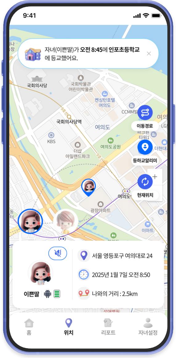 등하교 중이거나 외출 중일 때도 자녀의 위치를 한눈에 파악할 수 있어 예기치 못한 상황에도 빠르게 대응할 수 있습니다.