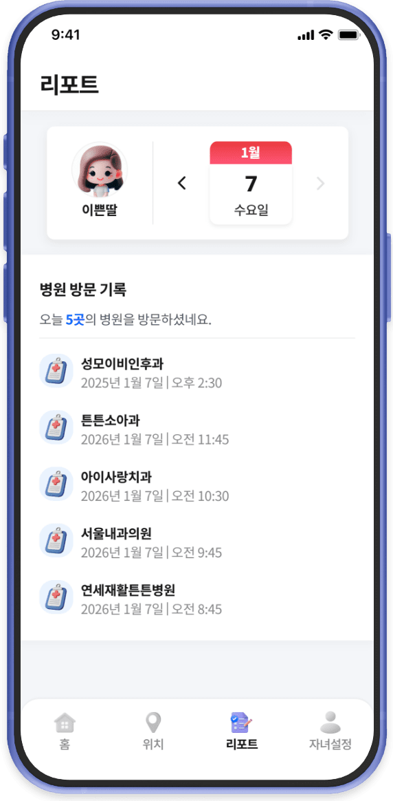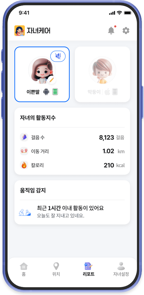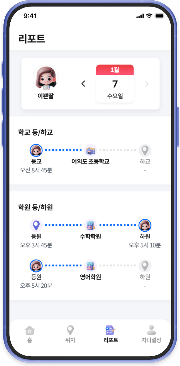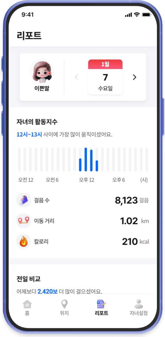 리포트를 통해 자녀의 하루 일상을 한눈에 확인할 수 있어요.