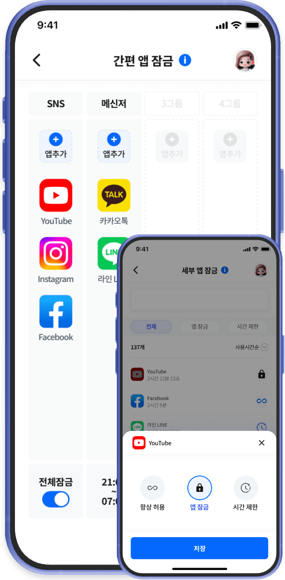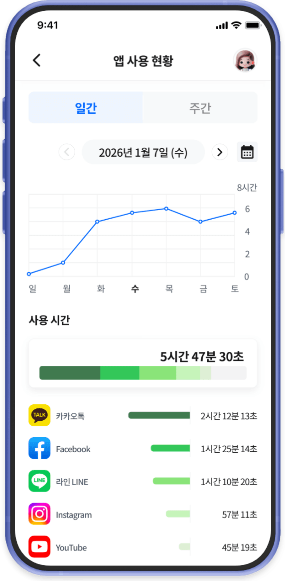 게임, SNS, 유튜브 등 과도한 사용을 관리할 수 있으며 올바른 스마트폰 습관 형성을 도와줍니다.