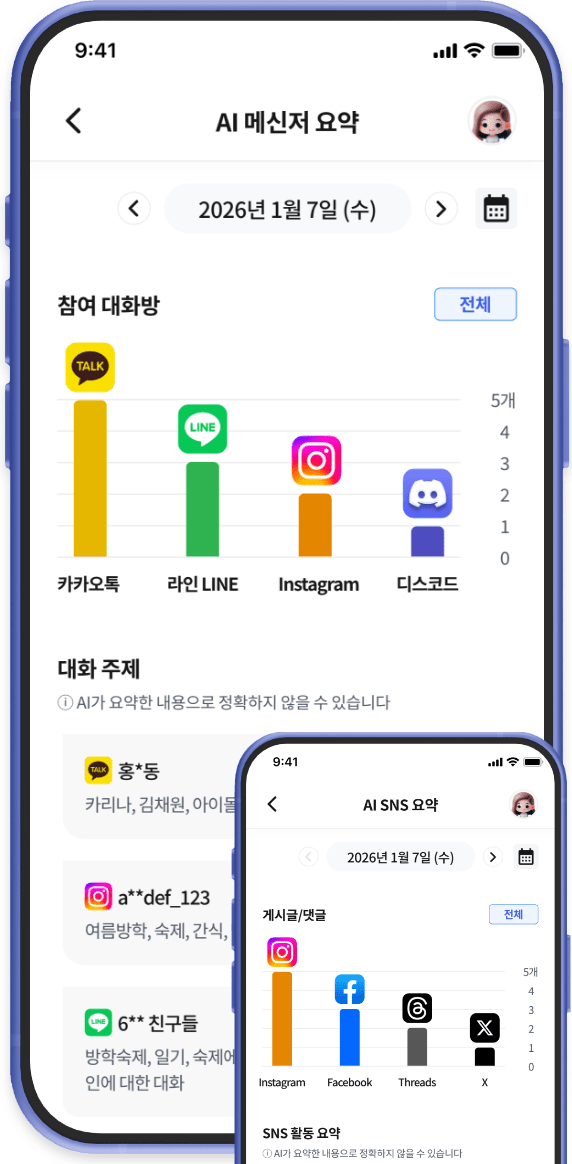 카카오톡, 인스타그램 등 SNS와 메신저 활동을 요약해 보여줘요.