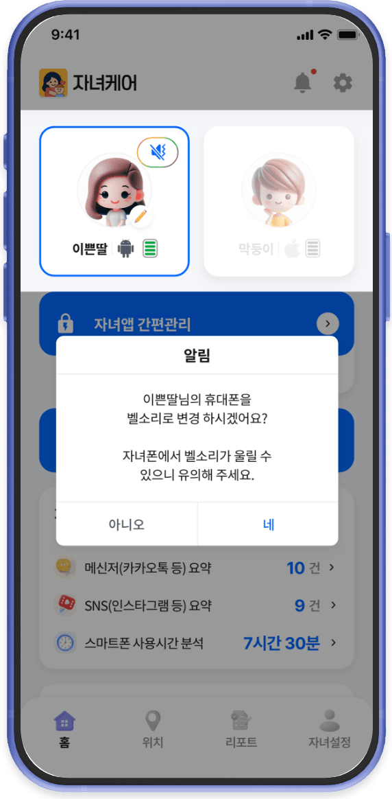 소중한 연락, 무음으로 놓치지 않게 자녀의 휴대폰을 원격으로 벨소리 모드로 전환할 수 있어요.