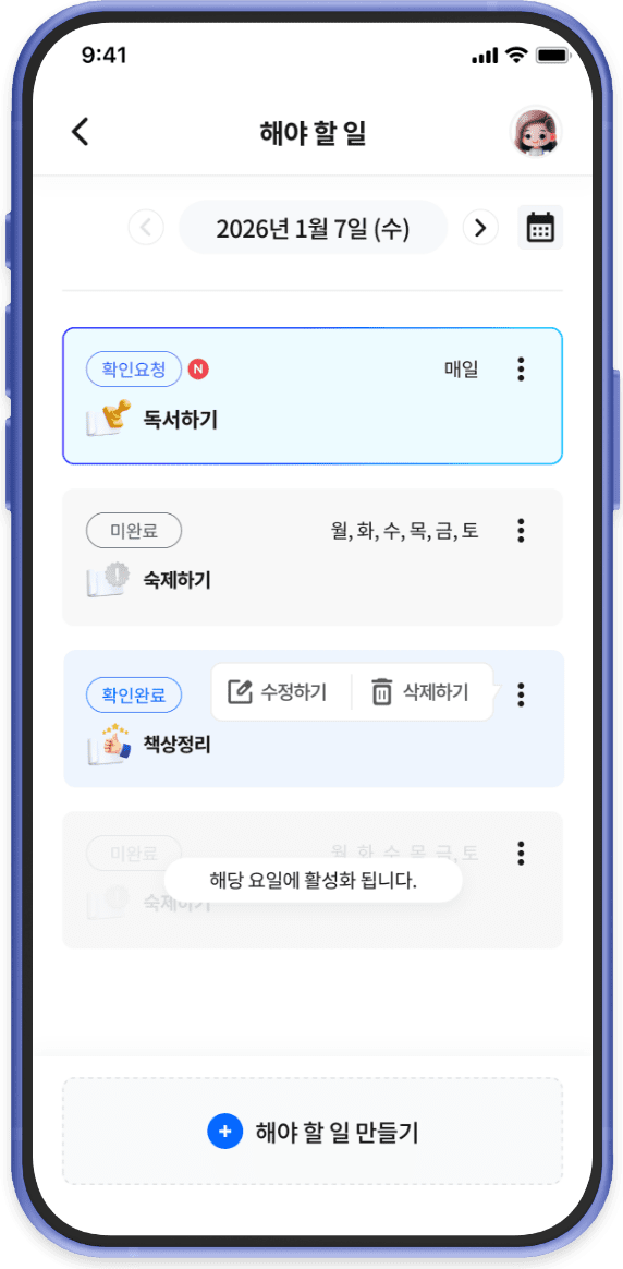 부모가 자녀에게 해야 할 일을 등록하고 관리할 수 있어요.